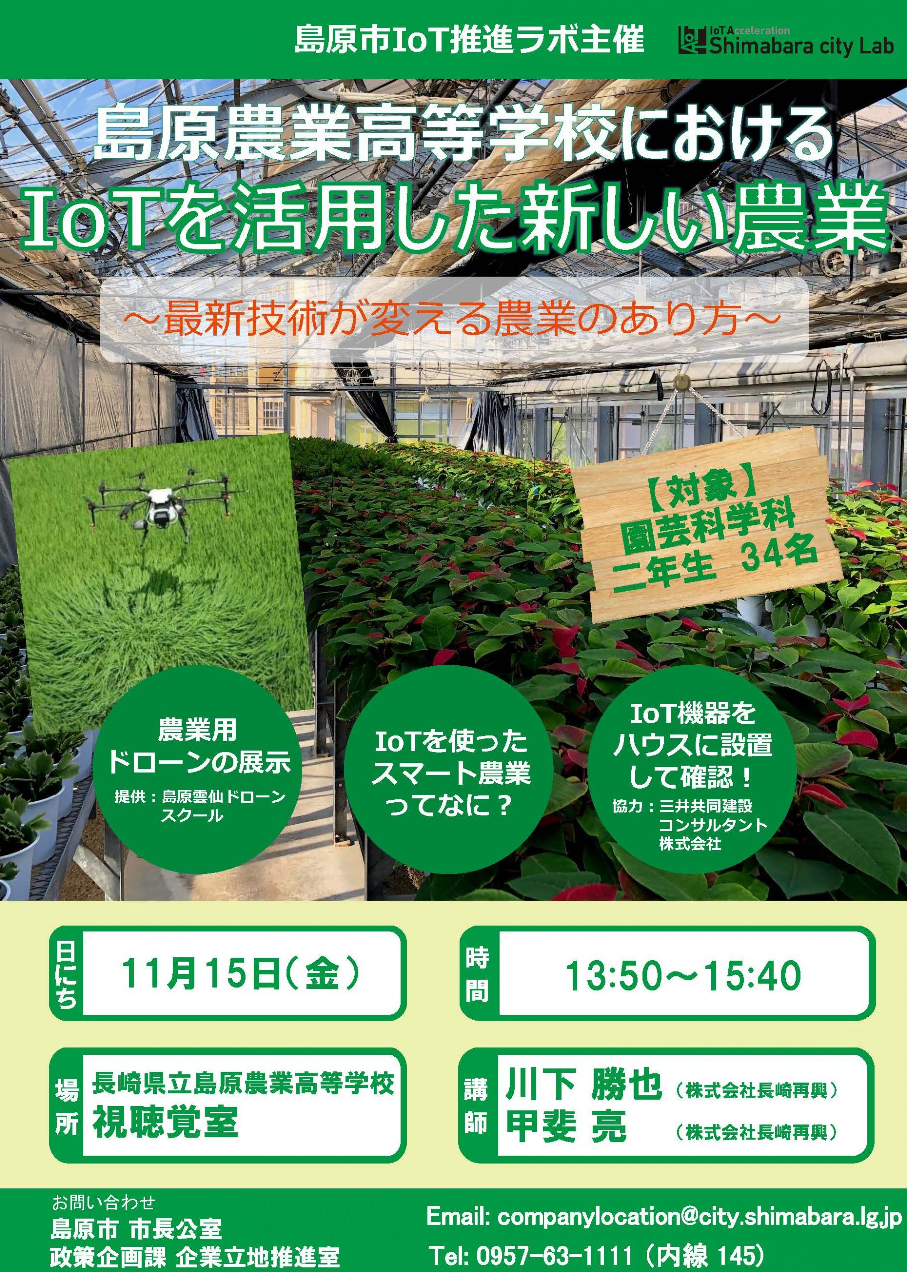 島原農業高校にてIoTに関する講演を実施 アーカイブ 2019.11.282025.09.08 2019年11月15日に長崎県島原市の島原農業高校にて「IoTを活用した新しい農業〜最新技術が変える農業のあり方〜」と題して、園芸科学科2年生34名を対象に、弊社 甲斐と川下が登壇した。 チラシ表 島原新聞2019年11月17日 記事抜粋 301 Moved Permanently